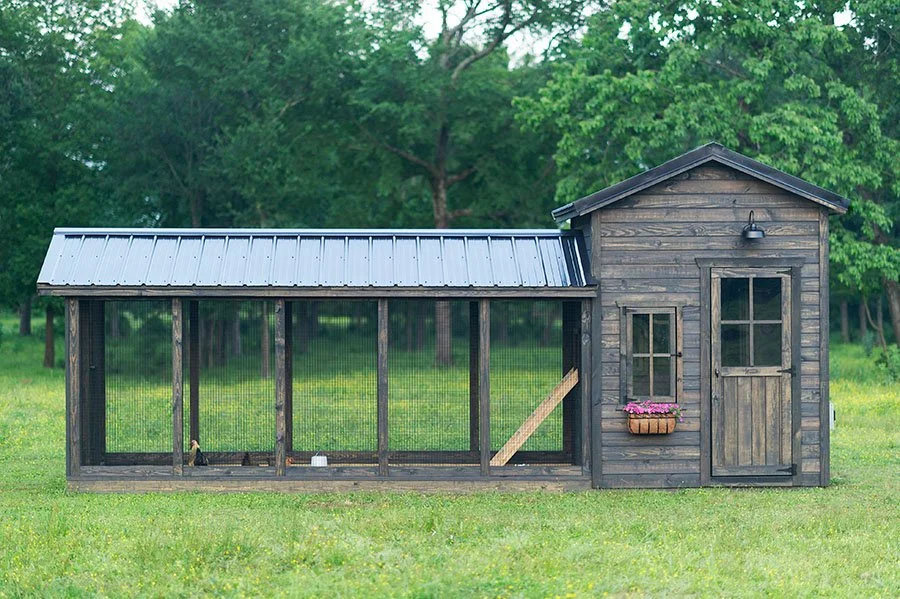 A wooden chicken coop with a metal roof on a grassy field, surrounded by trees.