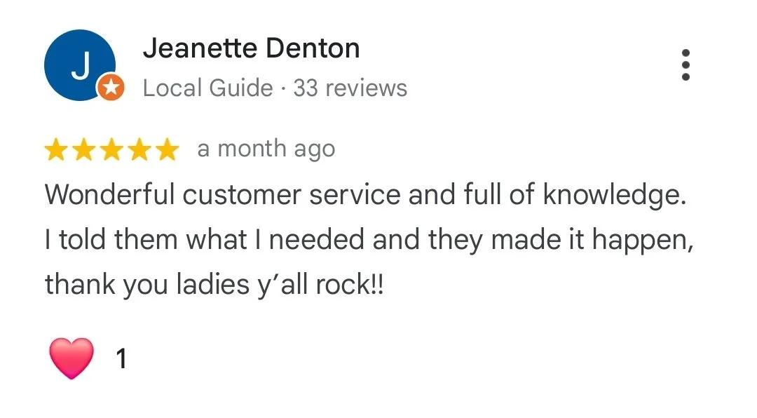 Screenshot of a Google review for Jeanette Denton, a local guide, with five stars and positive feedback about her excellent customer service.