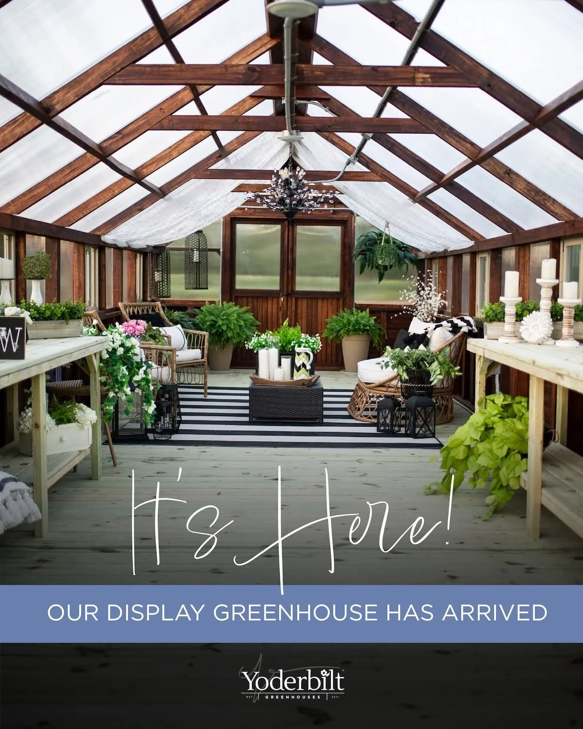 A greenhouse interior with wooden framing, glass walls, and a decorative black chandelier. It is filled with various potted plants and decorated with white candles, lanterns, and black-and-white accents. There are benches and a striped rug on the wooden floor, creating a cozy, stylish space. Overlaid with text reading 'It's Here! Our Display Greenhouse Has Arrived' and the logo of Yoderbilt Greenhouses.