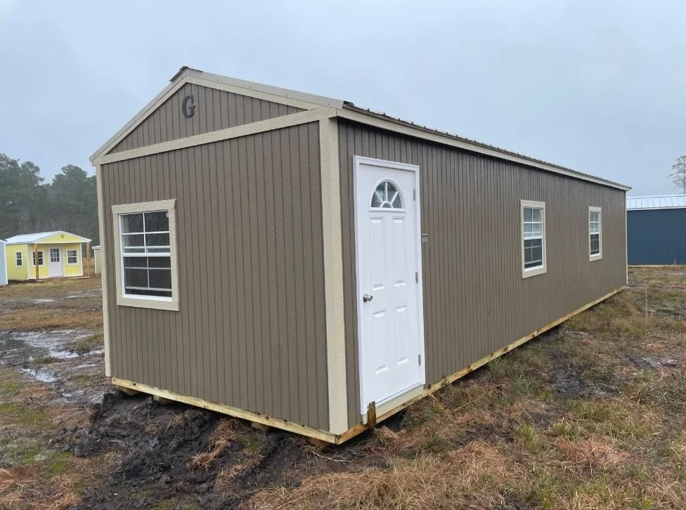 A prefab portable building with a brown exterior, white door, and three windows, situated on a muddy, grassy lot.