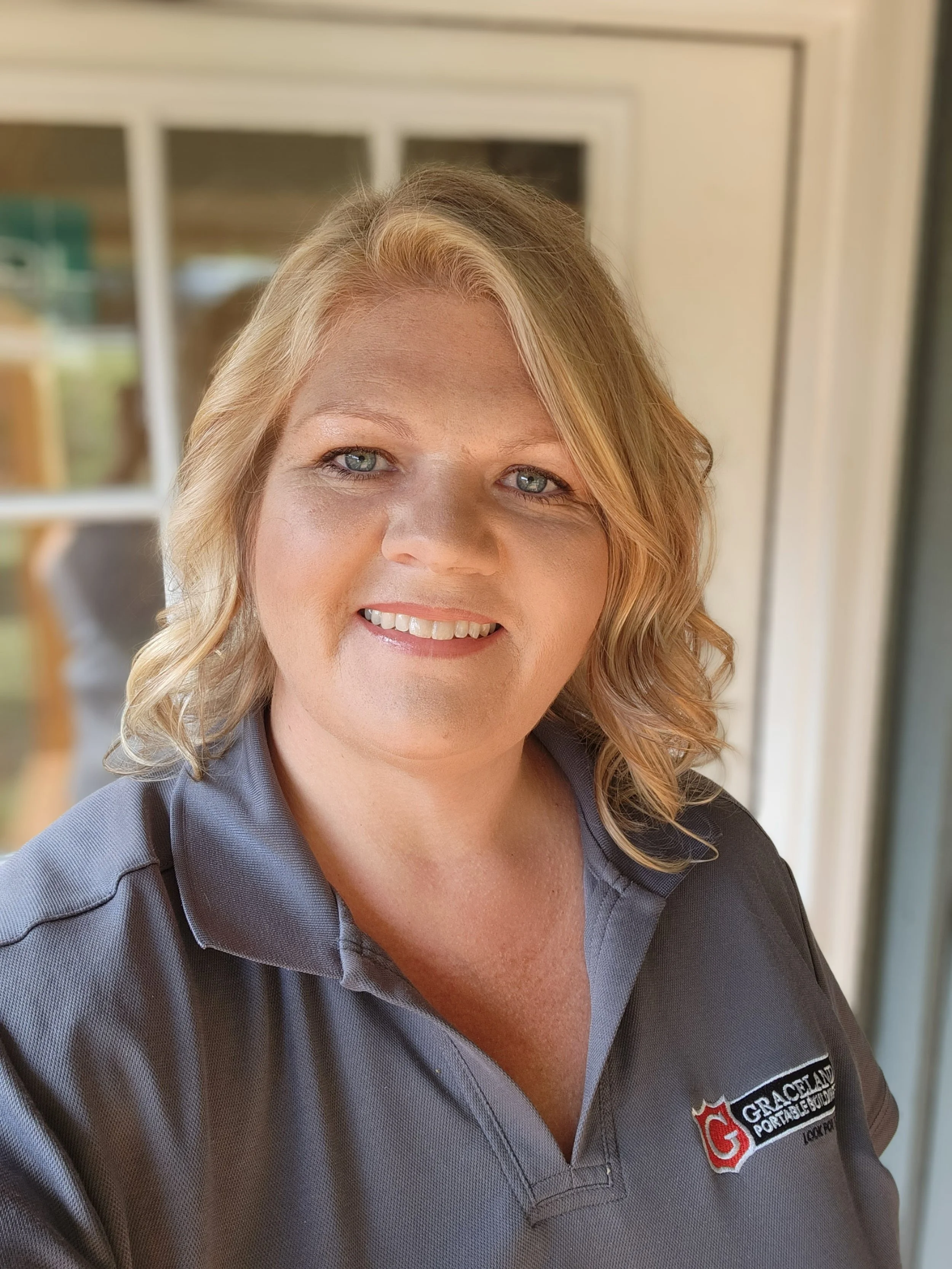 A smiling woman with shoulder-length blonde hair wearing a gray polo shirt with a logo that reads "Grace]e and Portable Bath." She is standing outdoors with a window behind her.