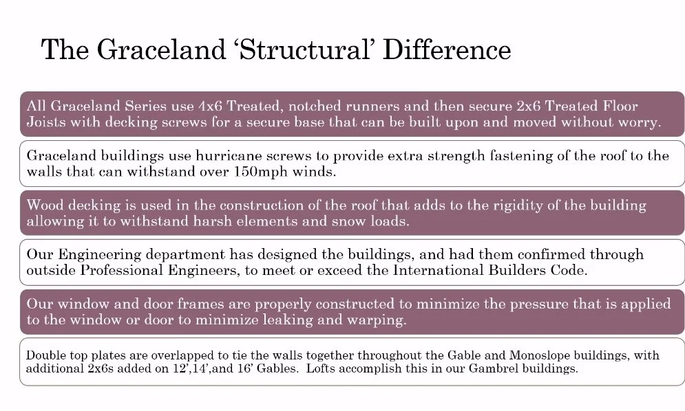 Text comparing the structural differences of Graceland buildings, including use of treated runners, hurricane screws, wood decking, engineering design, proper window and door frames, and overlap of double top plates in construction.